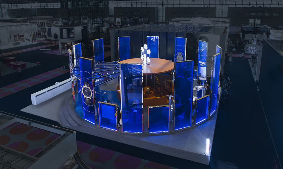 展館進(jìn)出口處4塊5米亞克力高墻分別對本次展出的3個明星系列表款進(jìn)行重點(diǎn)展示;展臺更以腕表中從一到十二的羅馬數(shù)字陳列展示3個系列的不同表款。