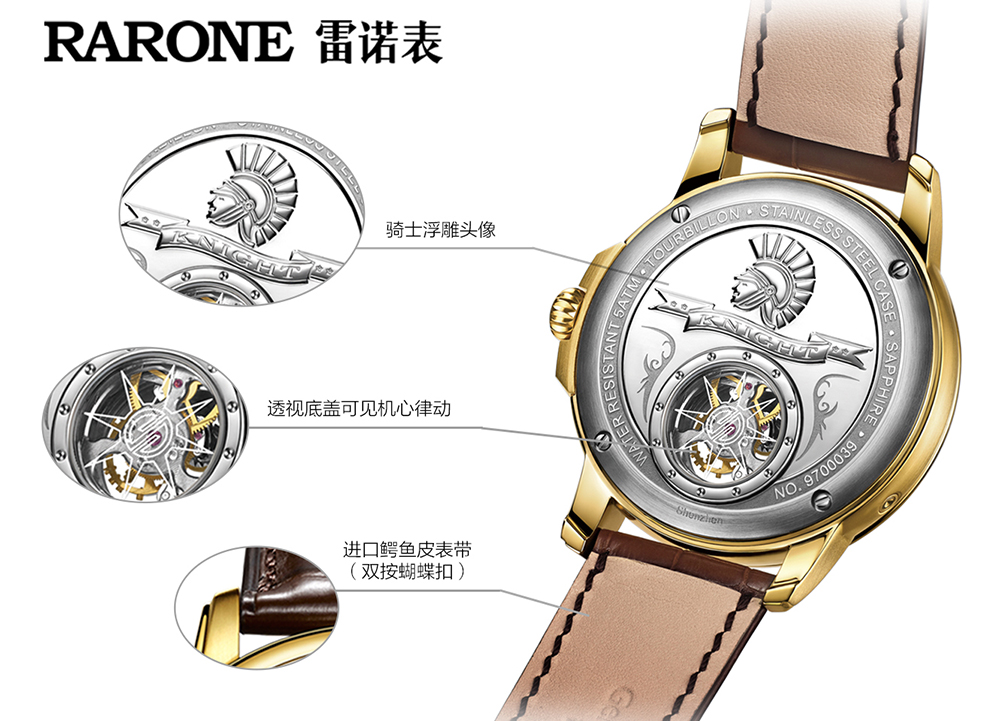 隱藏在后蓋上浮雕的騎士榮耀標志,低調(diào)的印刻著騎士的精神信仰,透視的底蓋可見機心律動。除此之外,18K金的包圈及鱷魚皮表帶的配置,不但佩戴舒適,讓遠方這一路陪伴倍感安心。